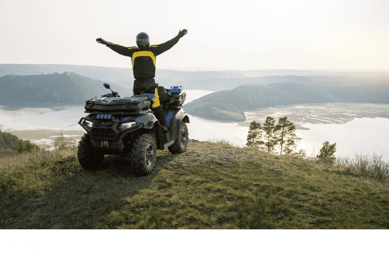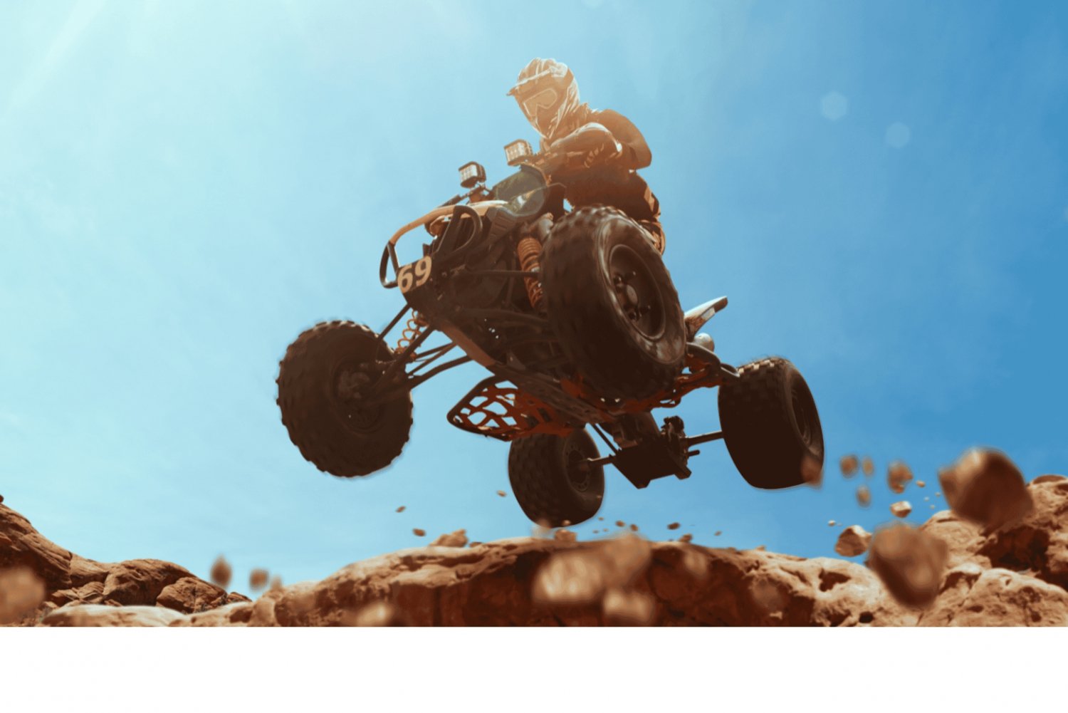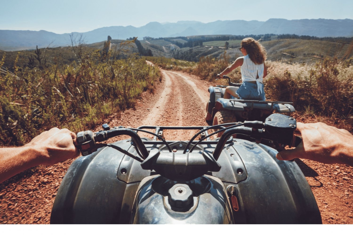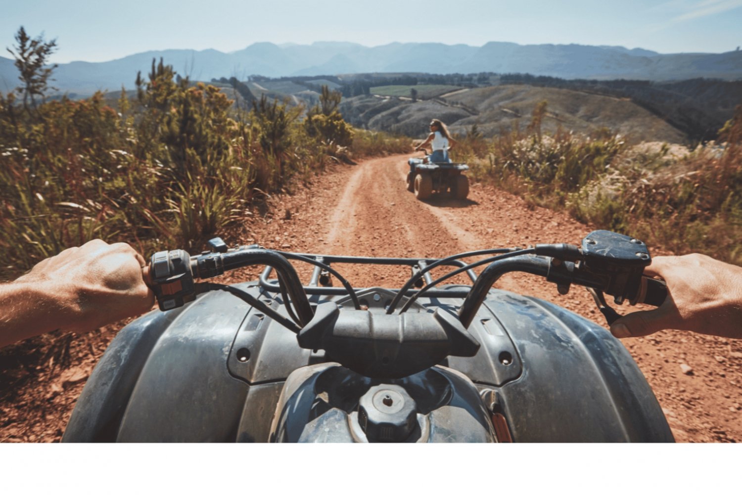 - 険しいトレイルや風光明媚な風景の中を走るスリル満点の四輪バイク。